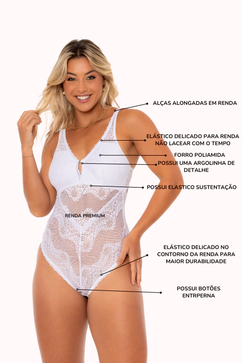 Confeccionado em renda, busto forrado em microfibra para melhor conforto, sem transparência nos seios