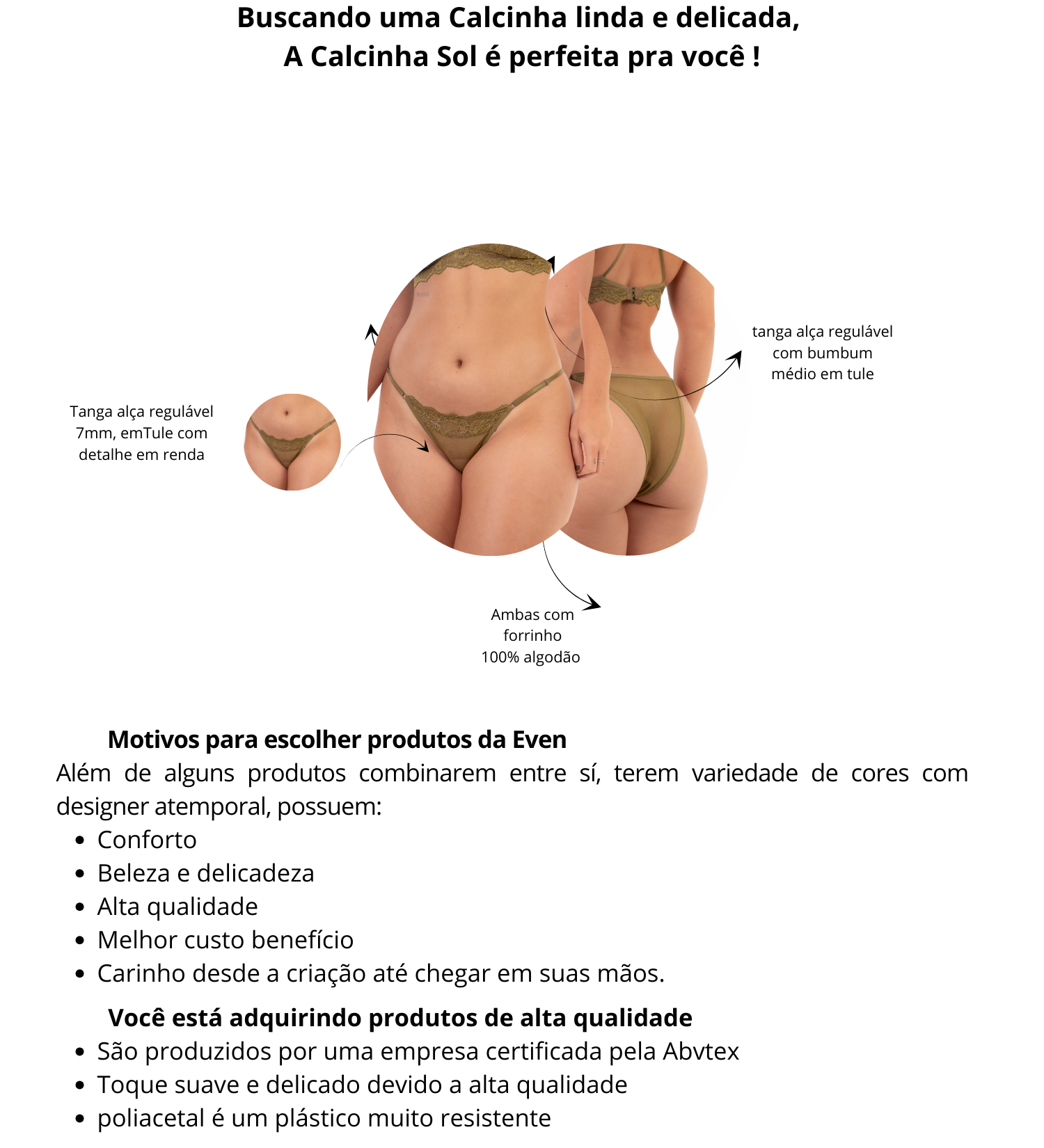 A modelagem foi pensada para valorizar as suas curvas, deixando você ainda mais confiante. Se você adora calcinhas que aliam estilo e praticidade, a Tanga Sole é a opção perfeita para você!