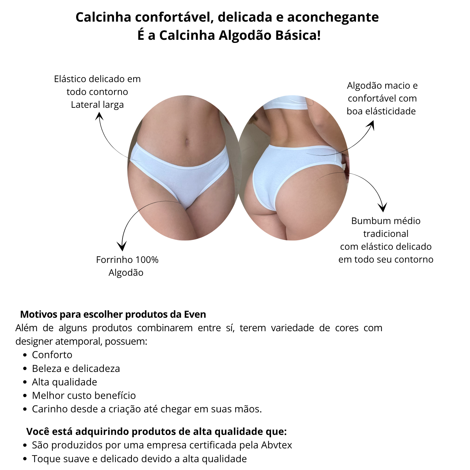 Confeccionada em algodão macio, lateral larga com aproximadamete 5cm, um elástico delicado em todo contorno da perna e cintura super confortável na cintura, forrinho 100% algodão, ideal para quem gosta de calcinhas básicas e confortavéis para o dia a dia.