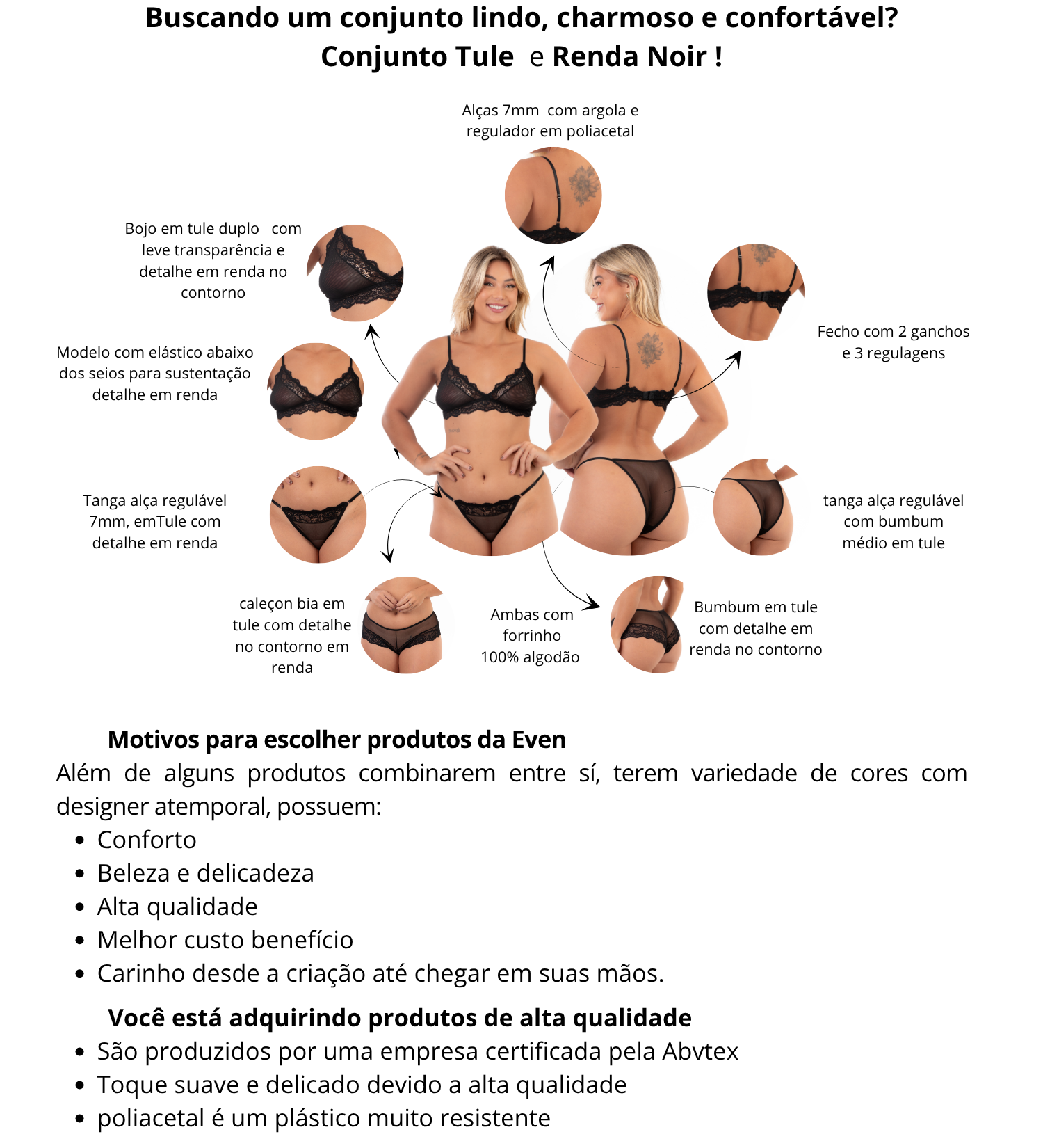 Confeccionado em renda e tule , possui tule duplo com leve transparencia, colchete costas com 2 ganchos e 3 regulagens, alças de 7mm reguláveis com metais em banho ônix.
